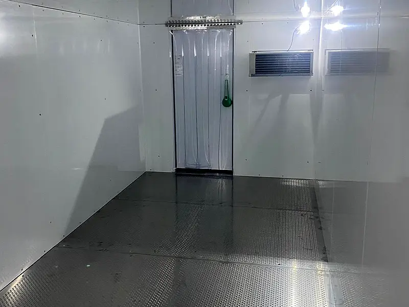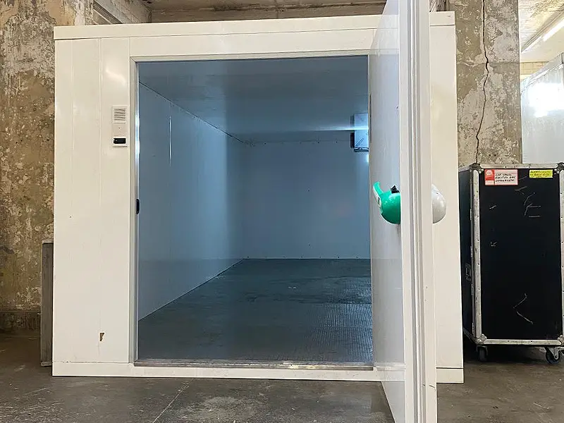 The modular 2.4m x 3.6m freezer room is assembled from high-performance insulated panels designed to retain low temperatures efficiently. All panels are thoroughly cleaned prior to installation. Internally, the unit features a stainless steel floor, providing durability and safe footing within the frozen environment.
